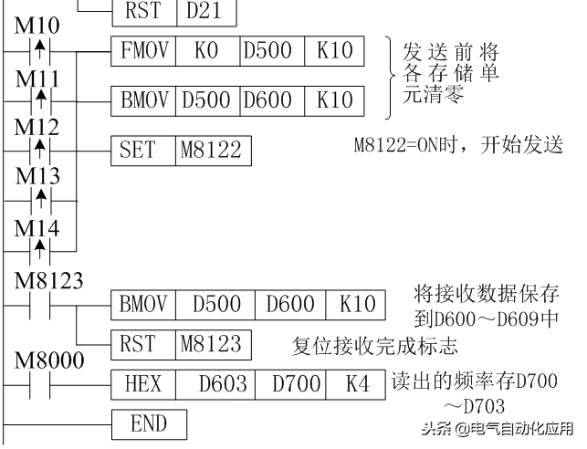 D500~D509为接收数据的地址,D600~D609为接收数据的存储地址.