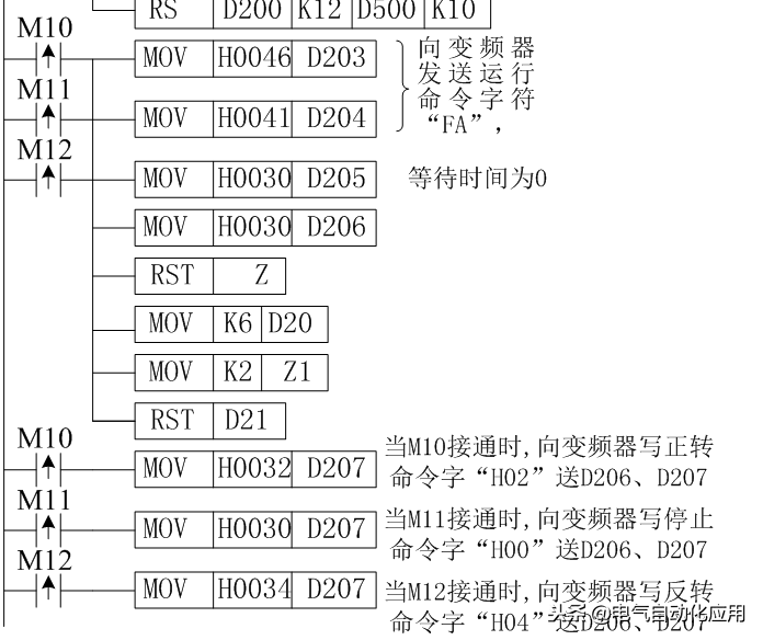 当M10、M11、M12任何一个接通时,PLC首先向变频器发出运行控制信号,D200~D209为发送数据的地址,其中D200存通信请求代码05H,D201、D202存变频器站号0,D203、D204存指令代码(运行命令字FAH),D205存等待时间(0ms),D206~D207存发送数据(D206、D207存正转02H/反转04H/停止00H),D208~D209存和校验码。