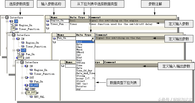 变量声明:分别定义形参、静态变量和临时变量(FC块中不包括静态变量);确定各变量的声明类型(Decl.)、变量名(Name)和数据类型(Data Type),还要为变量设置初始值(Initial Value)。如果需要还可为变量注释(Comment)。在增量编程模式下,STEP 7将自动产生局部变量地址(Address)。