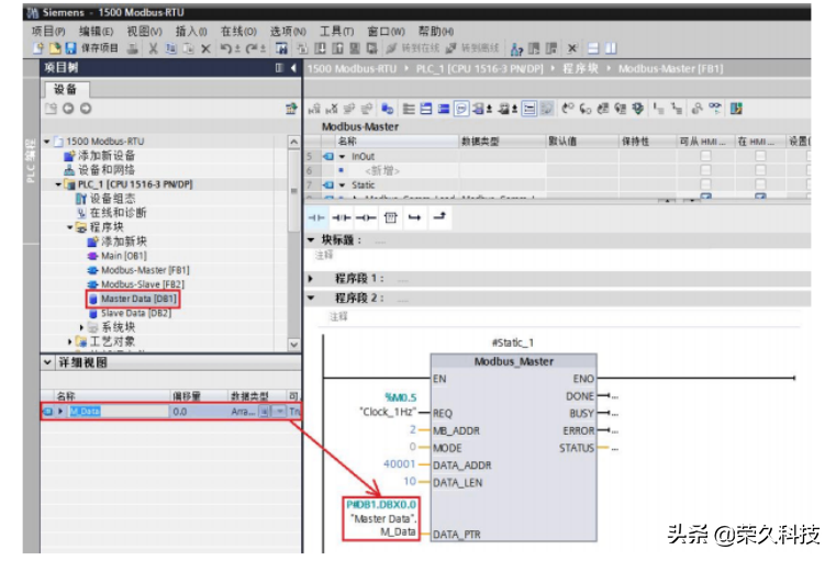 接下来,通过对 “Modbus_Comm_Load ”指令的 “MD_DB ”参数赋值,将 “Modbus_Comm_Load ”指令与 “Modbus_Master ”指令进行关联,即将 “Modbus_Master ”指令的背景 DB 块中静态变量 “MB_DB ”赋值给 “Modbus_Comm_Load ”指令的 “MD_DB ”,可以通过拖拽的方式来实现,拖拽路径如下图 12。