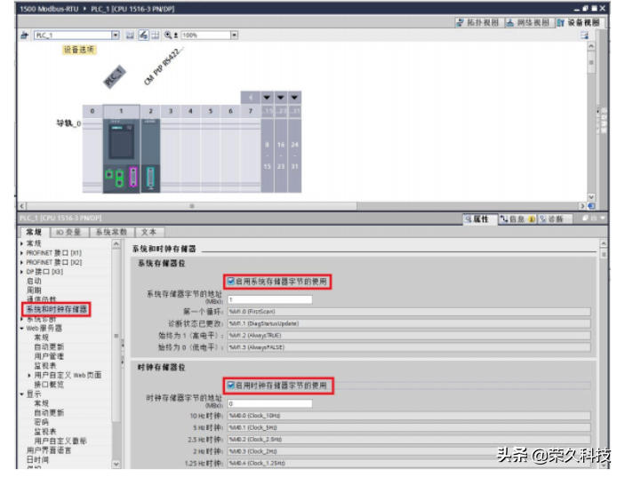 然后激活 CPU 的“系统和时钟存贮器功能”,如下图 3 。(本例程中使用了CPU 首次扫描位来实现 Modbus 的初始化,使用 CPU 的时钟信号来控制发送频率,该方法供参考。)