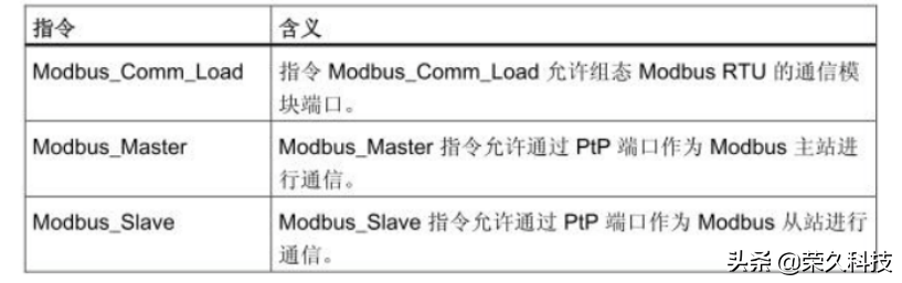 S7-1500 实现 Modbus-RTU 功能,需要调用以下指令,见下表 3,其中 “Modbus_Comm_Load ”指令用于通信模块的组态, “Modbus_Master ” 指令和“Modbus_Slave ” 指令分别实现 Modbus 主站通信和 Modbus 从站通信“Modbus_Comm_Load ”指令和 “Modbus_Master ”/ “ Modbus_Slave ”指令是通过 “Modbus_Comm_Load ”指令的 “MB_DB ”参数来实现关联的。