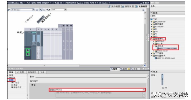 然后组态 ET 200SP 分布式 IO 站,并在该分布式 IO 上组态点对点通信模块,并将该模块的通信协议设置为 “Modbus ”,如下图 4。