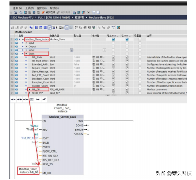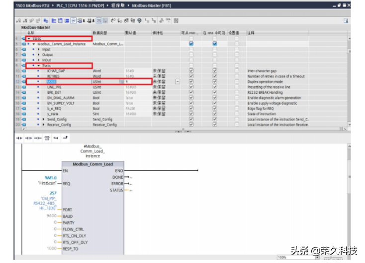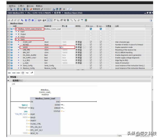 使用定义主站端口的工作模式相同的方法,将从站点对点模块的工作模式定义为RS485 ,所以需要将 “Modbus_Comm_Load ”背景数据中静态变量的 “MODE”参数赋值为 4,如下图 16。
