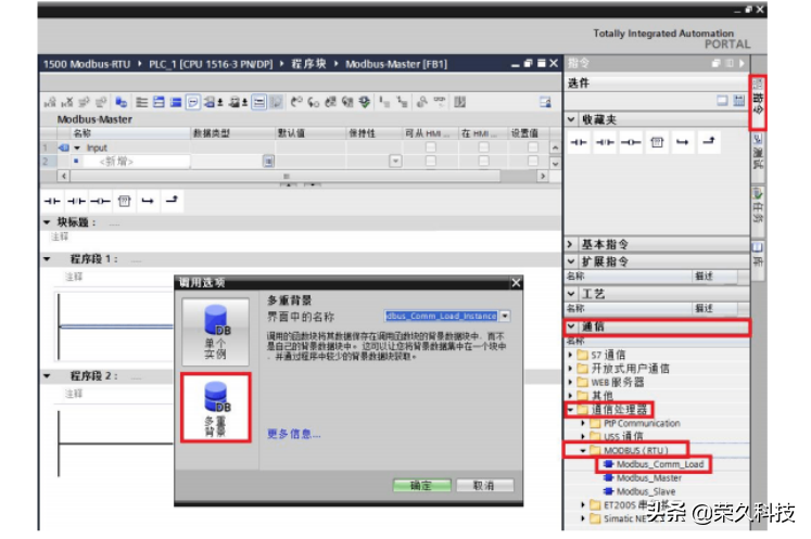 在该 FB 中以多重背景方式调用 “Modbus_Comm_Load ”指令,该指令在指令目录下“通信 —〉通信处理器 —〉Modbus (RTU )”下,如下图 6。