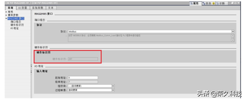 首先要为 “Modbus_Comm_Load ”指令指定端口,即该指令是针对哪个点对点模块进行参数化的。在硬件配置中,每个硬件均有一个硬件标识符,该硬件标识符在硬件属性中可以查看到,如下图 8。
