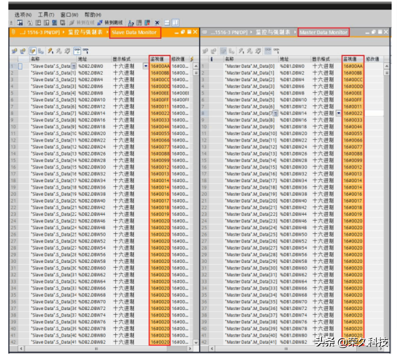 至此,程序编写基本结束,建立 2 个变量监视表,分别用来监视 Modbus 主站数据和 Modbus 从站数据,将该例程下载到 PLC 后,可以看到通信模块对应的收发 LED 指示灯在闪烁,表示端口正在发送 / 接收数据。将 DB 块“Slave Data ”中的变量赋值,监视主站 “Master Data ”中的变量,可以看到主站已经读取到从站的数据,如下图 20。