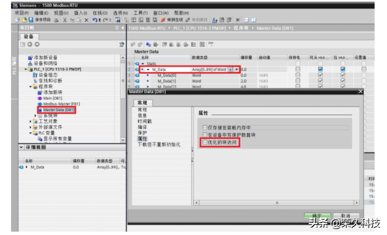 由于 Modbus 指令读取或写入的数据区必须为指针寻址,所以必须是有绝对地址的区域方可访问,而 S7-1500 创建的 DB 块缺省为优化的 DB 块,变量没有绝对地址,无法直接使用。本例中我们创建 DB 块,并在该 DB 块内创建一个名为 “M_Data ”的数组,类型为 WORD ,长度为 100 ,即创建了 100 个字的存储空间。然后在该 DB 块点右键,在属性中将“优化的块访问”前的勾去掉,重新编译该 DB 块,该 DB 块就会生成,可以看到每个变量都有偏移地址了,如下图 13。
