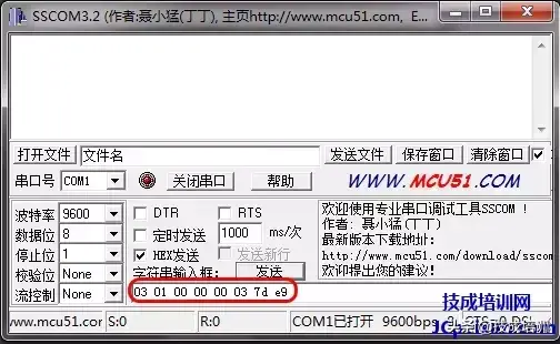 图2-4所示我们向从站发送03 01 00 00 00 03 7D E9其中03是从站地址,01是功能码,00 00是指起始地址是Q0.0, 00 03是指读取3个线圈,7D E9是前面数据的crc校验码。