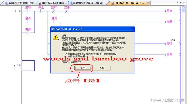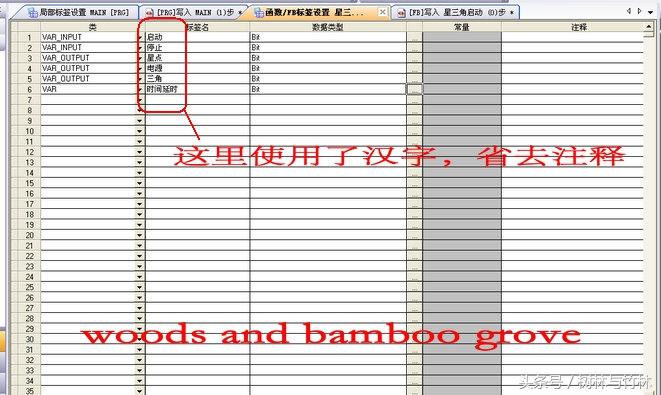 点击【确定】→点击FB管理下【局部标签】或PLC程序编辑框上方的标签【函数/FB标签设置】,星三角有两个输入量(启动、启动);三个输出量(星点、电源、三角);一个过渡变量(延时)