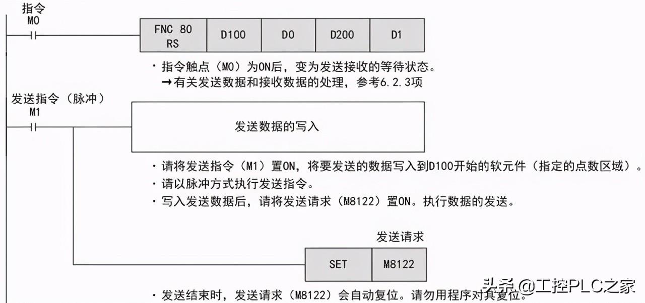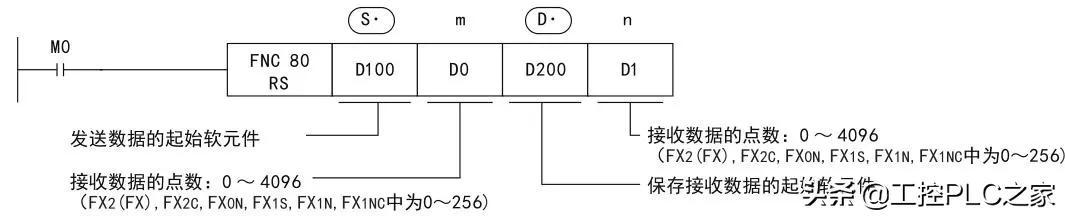 RS指令用于指定从FX可编程控制器发出的发送数据的起始软元件和数据点数, 以及保存接收数据的起始软元
