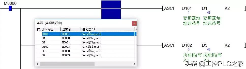 地址Address: 就是站号, 两个ASCII码组成, 例如站号1, 地址就是01H, 转成ASCII码就是30,31, PLC监控: