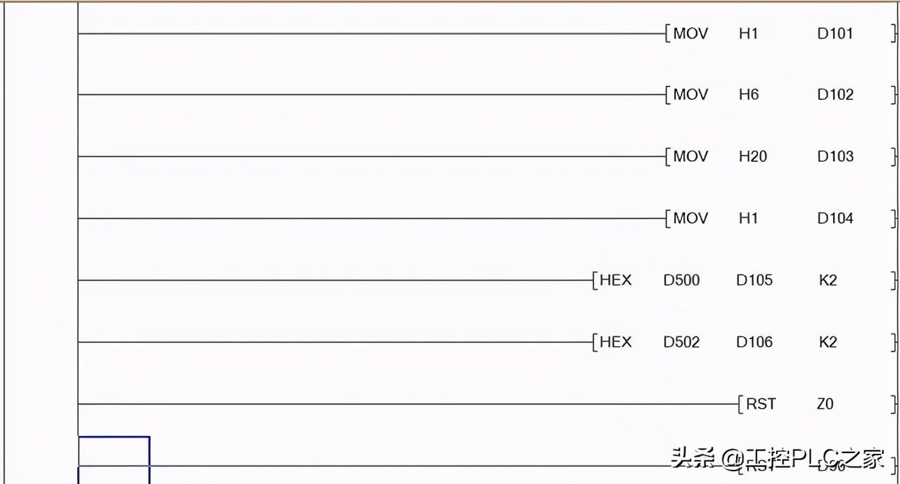 根据变频器的MODBUS功能,我们知道写入频率的地址是2001H, 因此高位20H传到D103,低位01H传到D104,然后将频率值传送到D105D106, 传送完毕LRC值复位。