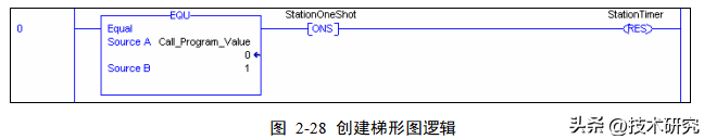 9. 按照上述方法,为 Assembly->Program_1_Press->Routine_Dispatch 例程创建如图2-28 所示梯形图逻辑,添加清除定时累加值所需指令 ONS 和RES。按下Insert 键,直接输入指令名称。由于本次实验中用到了的指令较多,不能一一介绍,对于不清楚的指令,您可以直接与指导老师沟通,或单击 Help->Instruction Help(指令帮助),查阅相关指令的帮助。