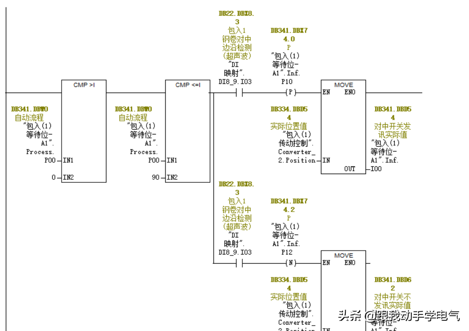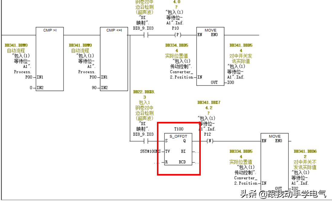 上面这段程序就是利用传感器的上升沿和下降沿来计算钢卷的宽度,从而来定位小车走到钢卷的中心位置,在现场调试中发现,偶尔会出现小车走不到位的情况,经过现场排除,发现是由于下降沿信号提前来了,经过现场的仔细排查,最后确定是由于干扰造成的,并且现场的电缆路径不好,无法将控制电缆与变频电缆有效分开,所以,就在下降沿信号后增加了一个断开延时定时100ms(这里主要考虑的就是程序的扫描周期大致150ms左右,也就是说干扰造成的也就是在某个扫描周期中造成信号的丢失),改后程序如下图所示: