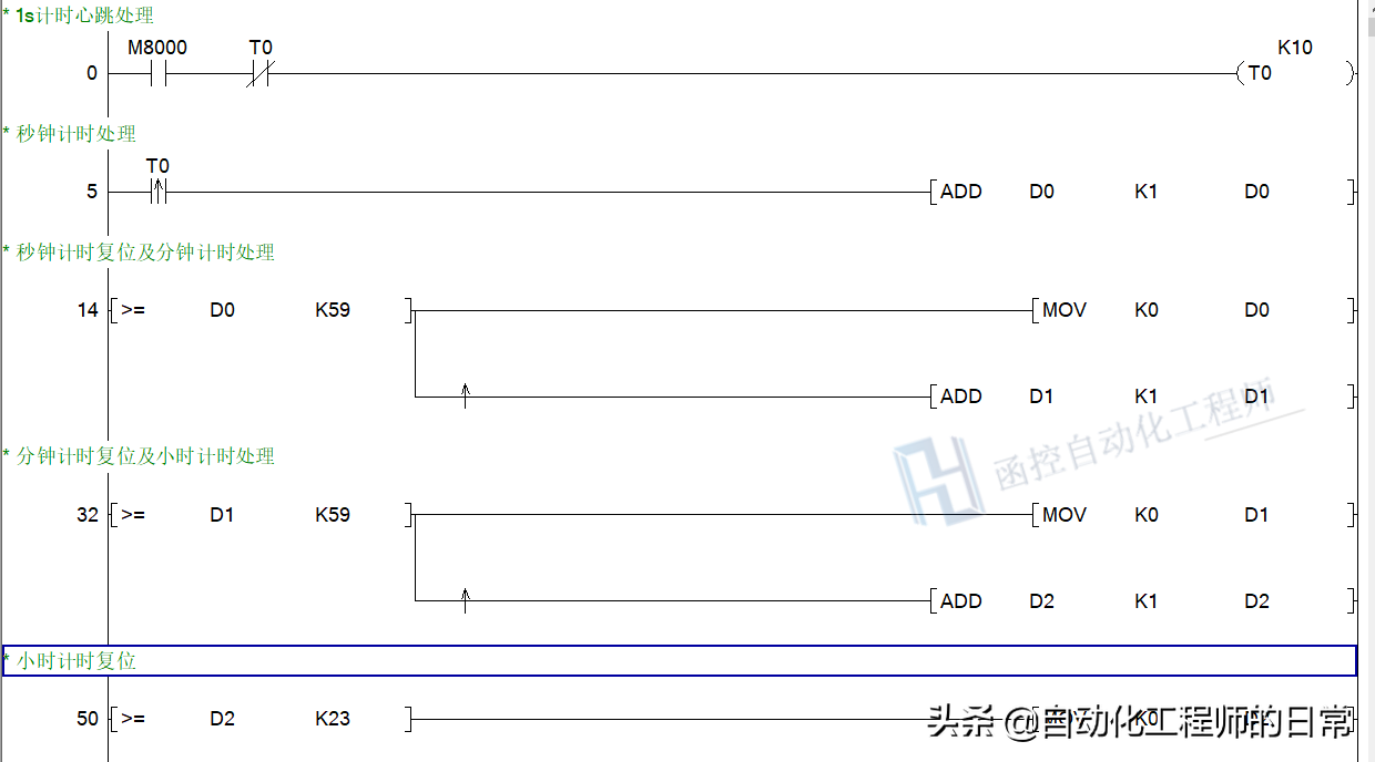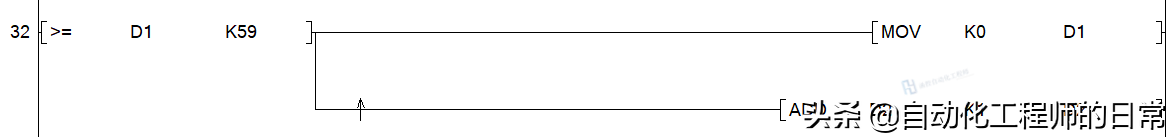 取1s定时器的触点导通的上升沿信号,对秒钟加一计时。每计时一秒,则D0加1.