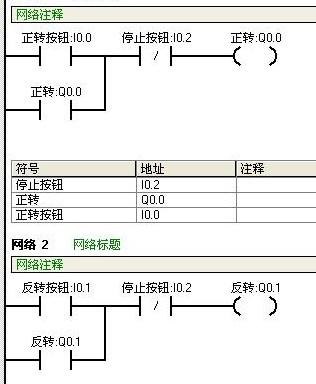 首先在2个自保持回路中加入互锁电路——网络1的Q0.1常闭点和网络2的Q0.0常闭点。题意2说按下停止按钮后5秒,才能按启动按钮,所以网络3按下I0.2停止按钮后,M0.0得电自保持,计时器T37计时5s后,将M0.0的自保持回路停掉。并且在网络1和网络2中加M0.0的常闭点,使M0.0得电时网络1和网络2即使按了正转按钮或者反转按钮也不会使Q0.0或Q0.1得电。