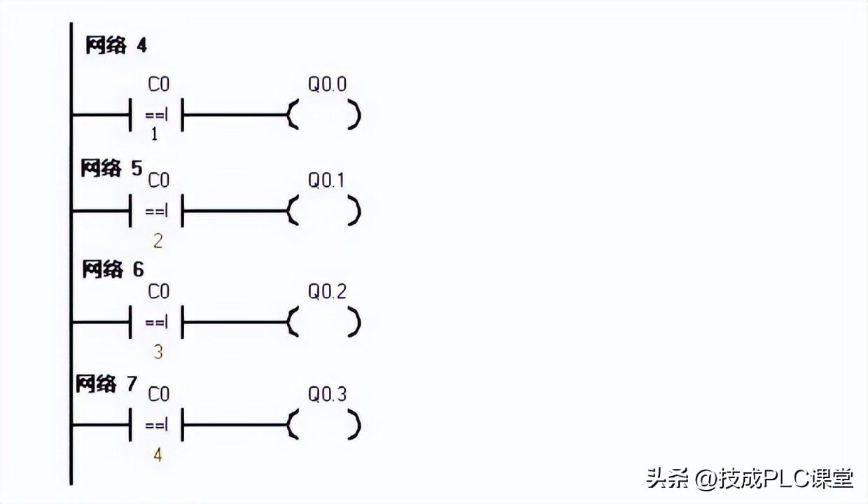 PLC一上电后sm0.0一直保持接通。所以t37进行延时计时,延时到后启动t38计时,t38计时到后t38常闭触点断开所以t37断开计时,t37常开触点恢复为常开所以t38也断开计时。此时t38的常闭触点恢复为常闭所以t37又重新计时,同时计数器C0开始计数一次。如此的反复计数。当计数为1时,Q0.0接通。计数器计数为2时Q0.1接通……