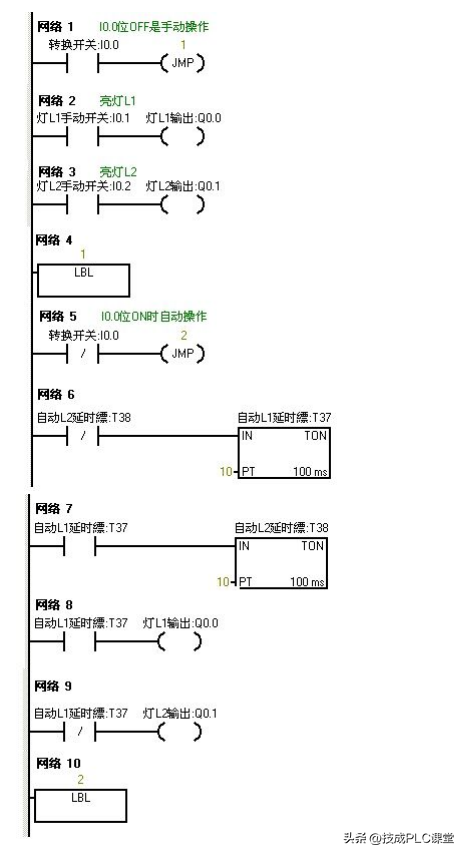 利用跳转指令控制两个灯L1和L2,分别接于Q0.0和Q0.1,切换开关位I0.0,两个灯的控制开关位I0.1和 I0.2.。手动时分别用两个灯的控制开关来控制。自动时,两个灯每隔一秒交替亮。
