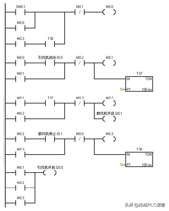 Sm0.1的特点在扫描的第一个周期接通,以后不接通 。当按下在线控制面板上的i0.0f时即 i0.0接通,此时Q0.0接通输出。(即指示灯Q0.0亮)引风机启动,同时定时器T37接通并开始计时,当定时器计数到50即(即指示灯Q0.1亮)鼓风机启动。此时两台风机都运行。