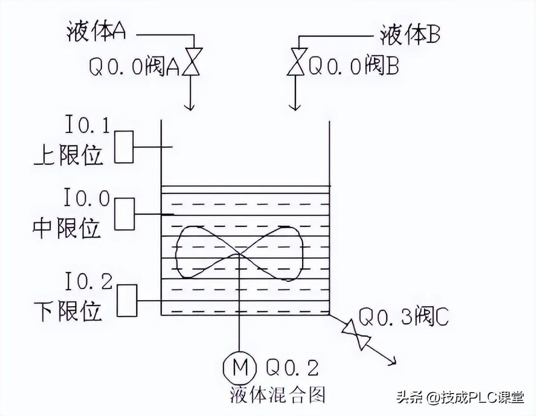 用S7-200实现液体混合的自动控制。当按下启动按钮后,液体阀A 打开 ,液体A流入搅拌机里面。当液位达到中限位时阀A关闭 ,同时打开液体阀B ,液体B流入搅拌机里面。当液位达到上限位时,阀B关闭 ,此时启动电动机进行搅拌。