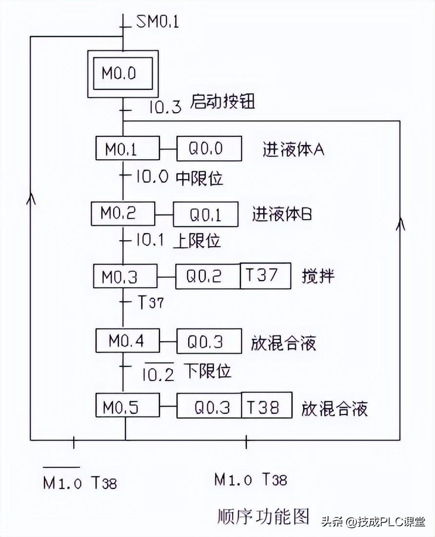 当按下在线控制面板上I0.1f(即上限位I0.1闭合)此时阀B关闭,电动机启动开始进行搅拌 ,(即Q0.1灭,Q0.2亮)同时定时器T37开始定时一分钟,一分钟后搅拌机停止搅拌,阀C打开(即Q0.2灭,Q0.3亮)当液位到达下限位后阀C继续打开(即Q0.3亮)同时定时器T38开始定时。