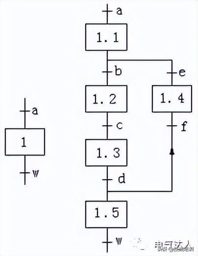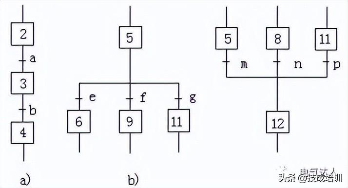 选择序列的开始称为分支,如图3b所示,转换符号只能标在水平连线之下。如果步2是活动的,并且转换条件e=1,则发生由步5步6的进展;如果步5是活动的,并且f=1,则发生由步5步9的进展。在某一时刻一般只允许选择一个序列。