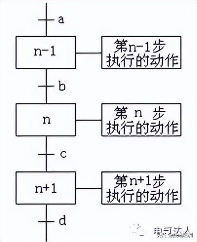 在功能表图中用矩形框表示步,方框内是该步的编号。如图1所示各步的编号为n-1、n、n+1。编程时一般用PLC内部编程元件来代表各步,因此经常直接用代表该步的编程元件的元件号作为步的编号,如M300等,这样在根据功能表图设计梯形图时较为方便。