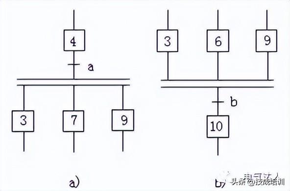 并行序列的开始称为分支,如图4a所示,当转换条件的实现导致几个序列同时激活时,这些序列称为并行序列。当步4是活动步,并且转换条件a=1、3、7、9这三步同时变为活动步,同时步4变为不活动步。为了强调转换的同步实现,水平连线用双线表示。步3、7、9被同时激活后,每个序列中活动步的进展将是独立的。在表示同步的水平双线之上,只允许有一个转换符号。