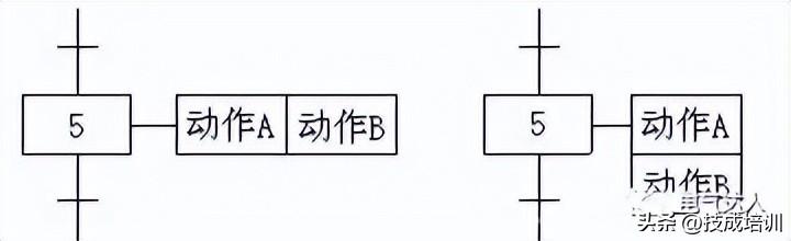 一个控制系统可以划分为被控系统和施控系统,例如在数控车床系统中,数控装置是施控系统,而车床是被控系统。对于被控系统,在某一步中要完成某些“动作”,对于施控系统,在某一步中则要向被控系统发出某些“命令”,将动作或命令简称为动作,并用矩形框中的文字或符号表示,该矩形框应与相应的步的符号相连。如果某一步有几个动作,可以用如图2所示的两种画法来表示,但是图中并不隐含这些动作之间的任何顺序。