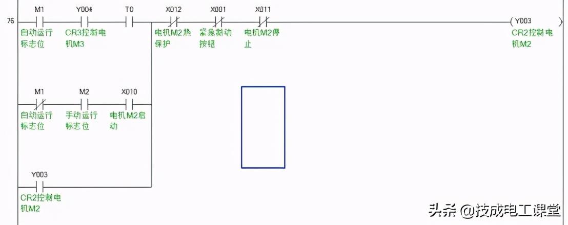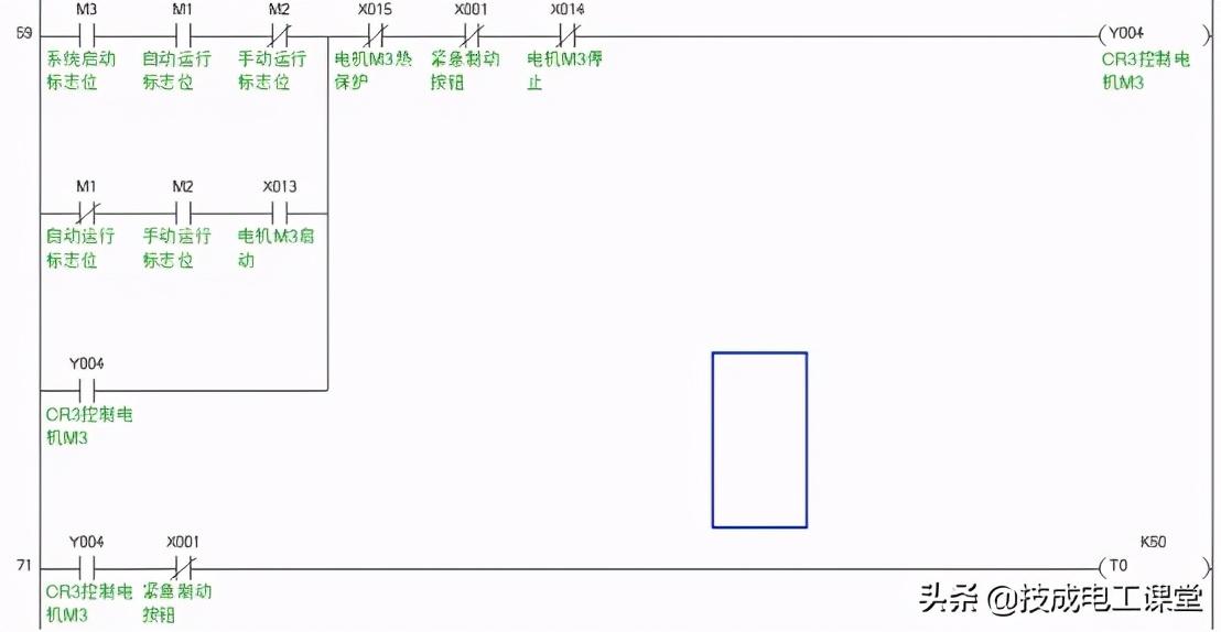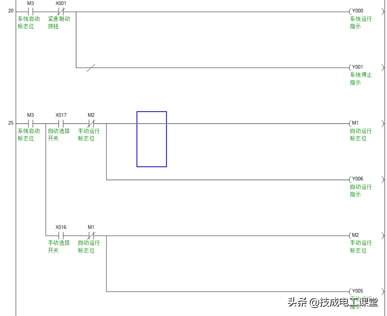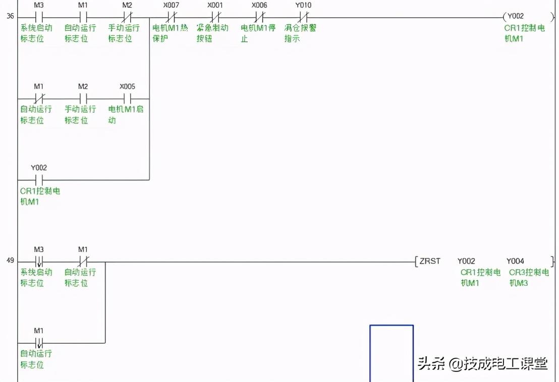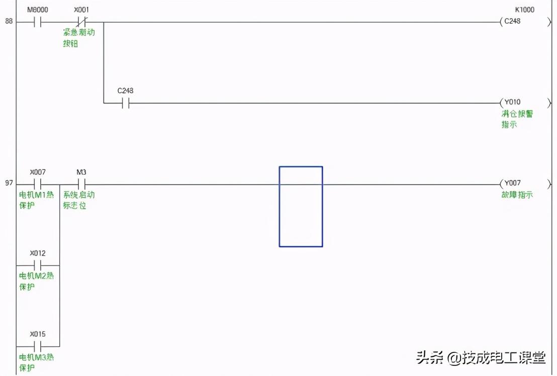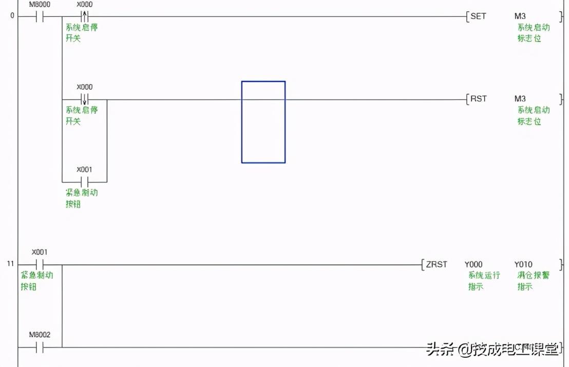 1、首先做上电复位及紧急制动时复位输出和计数器程序,合上系统启停开关,驱动系统启动标志位M3,断开系统启停开关,则复位标志位M3,按下紧急制动按钮时,也复位标志位M3。【案例源程序下载方式,请看文末】