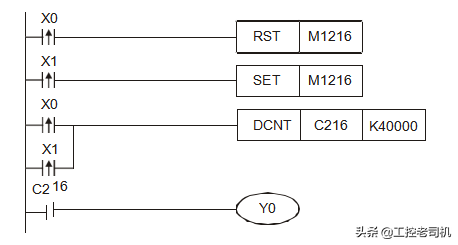 本例的关键是利用 32 位的加减计数标志 M1216 来控制 C216 的上下计数,X0 由 Off→On 变化一次,M1216=Off,C216 为上计数;X1 由 Off→On 变化一次,M1216=On,C216 为下计数。 当 C216 的计数现在值到达 40000 时,C216=On,Y0 变为 On,警报灯亮。
