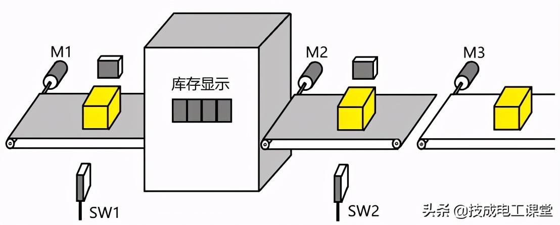 出库前必须先启动车间生产线的传送带电动机M3,半成品的出库通过光电传感器SW2进行检测,此外,还要求在半成品库中显示库存的数量。