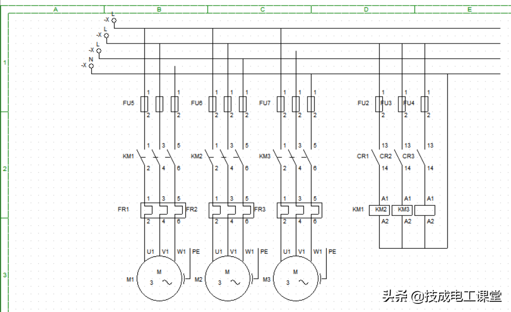传送带电机M1、M2、M3 分别用中间继电器进行控制,CR1的动合触点控制接触器KM1的线圈通电断电;