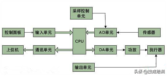 PLC控制系统主要由输入部分、CPU、采样部分、输出控制和通讯部分组成,如图1所示。输入部分包括控制面板和输入模板;采样部分包括采样控制模板、AD转换模板和传感器;CPU作为系统的核心,完成接收数据,处理数据,输出控制信号;输出部分有的系统用到DA模板,将输出信号转换为模拟量信号,经过功放驱动执行器;大多数系统直接将输出信号给输出模板,由输出模板驱动执行器工作;通讯部分由通讯模板和上位机组成。