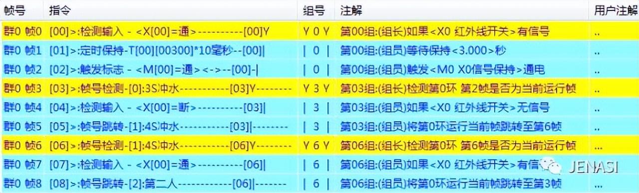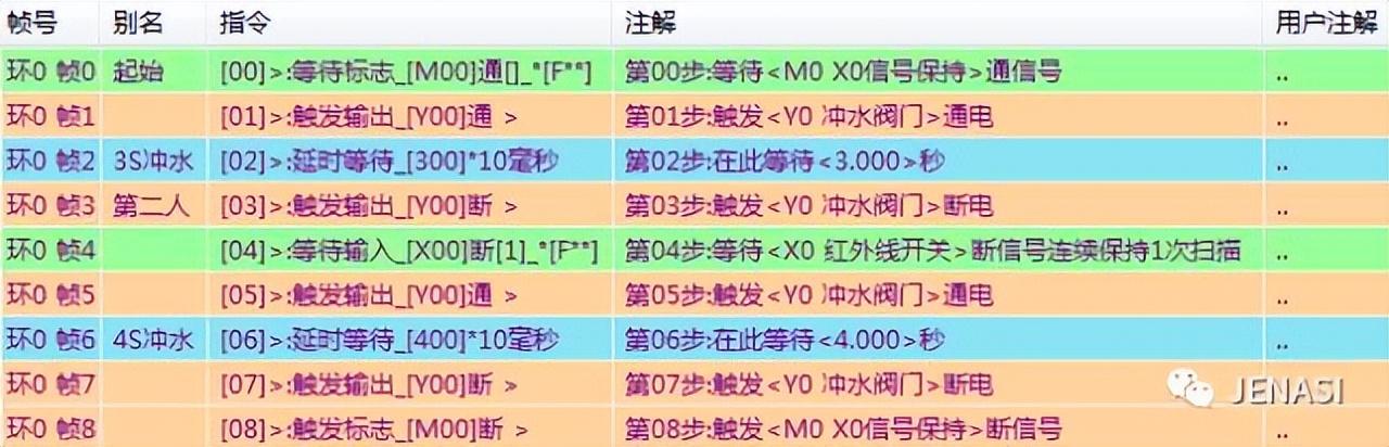 组合逻辑第6组: 在情况3的使用下,添加“帧号检测,检测别名:4s冲水”指令,也就是检测时序环0中的指令帧6:4s冲水是否为当前帧,若是当前帧,同时“检测输入X0通”(也就是说还在执行第二次冲水动作,就有第二名使用者准备使用),这时再添加“帧环跳转”指令,将时序环0当前动作跳转至帧3指令:触发Y0断,此时停止冲水,动作按照程序继续运行。这就是情况3:当第一名使用者离开后,进行的第二次冲水还未完成,就有第二名使用者前来准备使用,此时就停止冲水,按正常动作继续执行。