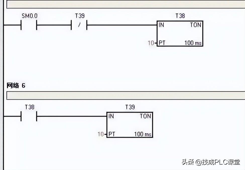 这次增加了网络4/5/6,网络5和6就是利用2个计时器产生一个一秒脉冲的小程序,SM0.0为特殊位,其功能为一直得电。网络4就是利用M0.1将网络1/2/3锁死,也就是说M0.1得电网络1.2.3是不起作用的。其原理与上一小结的M0.0一样。