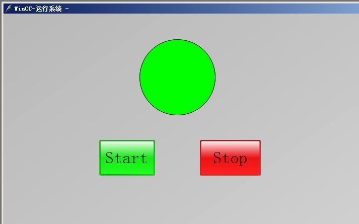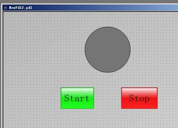至此,后台数据,已经全部完成,接下来,我们需要做一个UI界面,一个是开始按钮,一个是停止按钮,还有一个状态显示。我们还是在这个页面中点击图形编辑器,在页面上添加两个按钮和一个圆形状态框,如下图所示:
