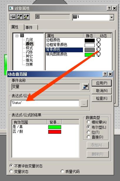 对于圆形状态框来说,同样绑定相应的事件,当变量为0的时候,背景色显示为红色,当变量为1的时候,显示为绿色,如下图所示: