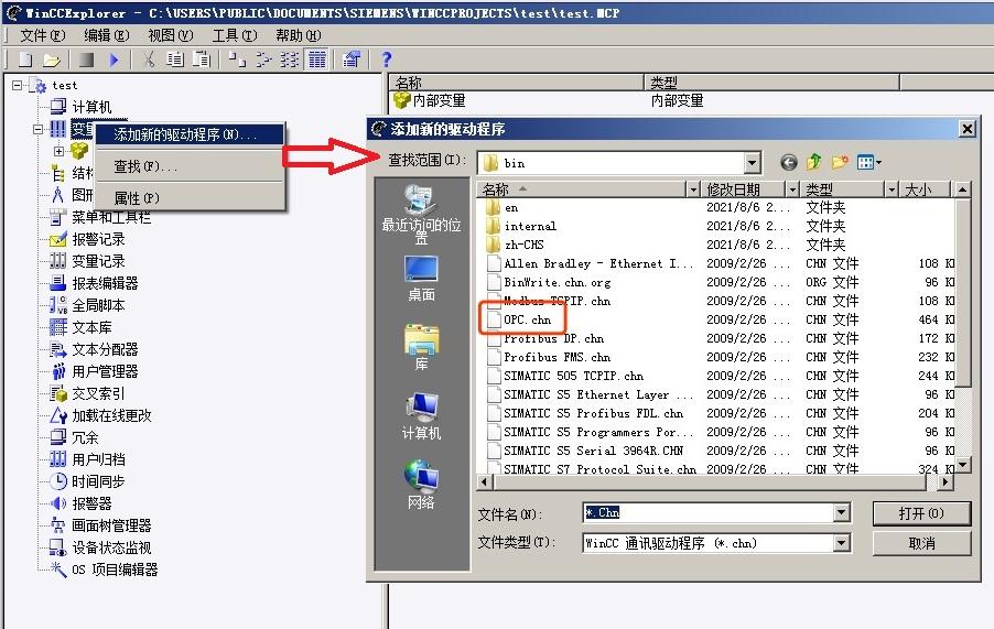 打开我们安装好的WinCC主窗口,找到左侧列表中的“变量管理”项目,右键菜单中选择“添加新的驱动程序”,在弹出对话框中选择“OPC.chn”,如下图所示: