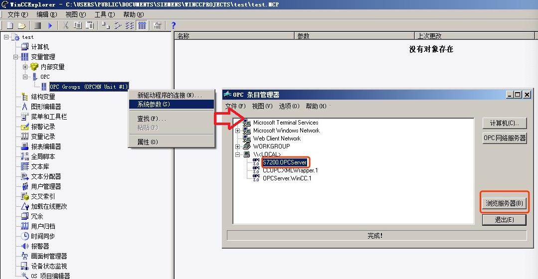 创建成功以后,看到在“变量管理”中新增了一个叫“OPC”的子项目,右键菜单选择“系统参数”选项,打开OPC条目管理器的对话框,找到我们干菜创建的S7200.OPCServer项目,然后点击“浏览服务器”按钮,如下图所示: