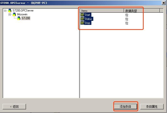 在打开的对话框中,找到我们刚才创建的3个变量,全选以后点击“添加条目”按钮,把我们创建的三个变量导入到WinCC里面,如下图所示: