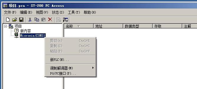 从西门子官网上下载完成PC Access以后,安装比较简单,安装完成以后,我们直接打开这个软件。在主界面中,我们看到,它已经检测到我们的PLC在COM3的接口处,如果显示不正确的话,我们可以通过右键菜单的PC/PG菜单项进行修改,如下图所示: