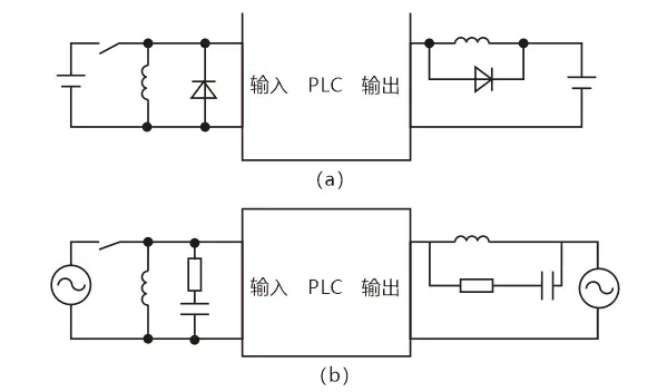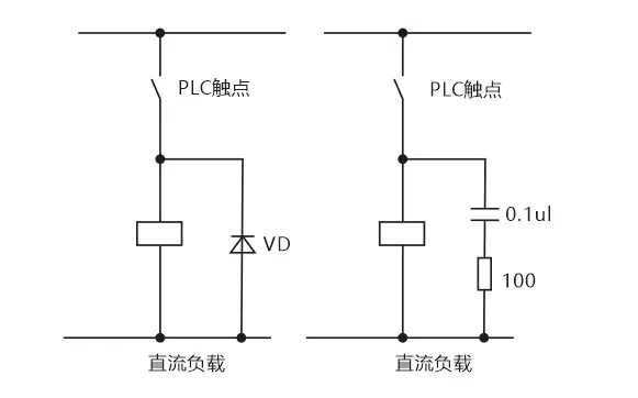 当PLC输入输出端接有感性负载元件时,直流输出的续流管保护(直流电路两端并联续流二极管),交流输出阻容吸收电路。