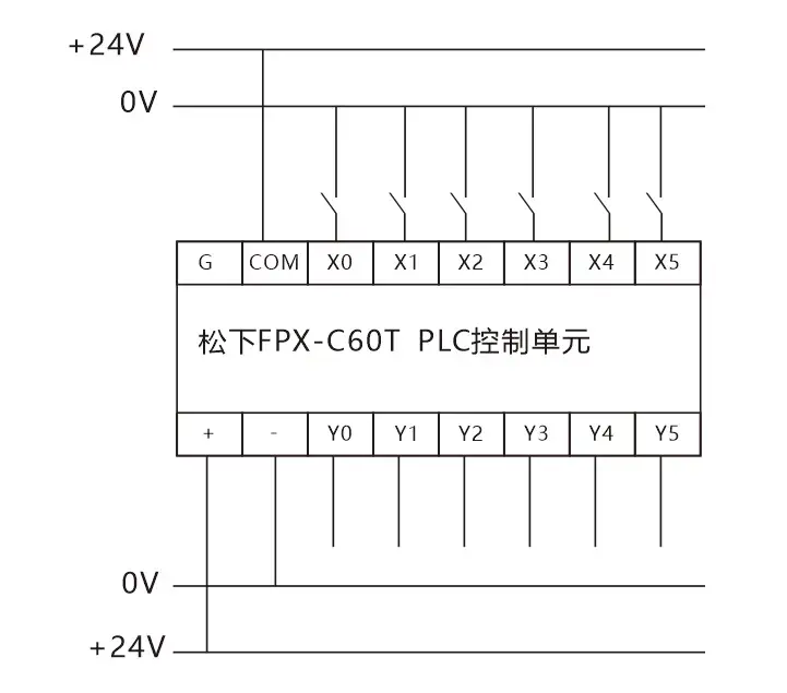 图中松下PLC为直流汇点式输入,即所以输入点共用一个公共端COM,同时COM端内带有DC24V电源,在编写程序时注意外部设备使用的是常闭还是常开触点