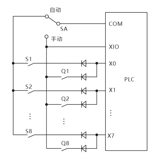 如图上系统分自动和手动两种工作方式,Q1-Q8为手动方式用到的 输入信号,S1-S8为自动方式用到的输入信号。S1和Q1共用输入点X0,PLC运行时只会用到其中一组信号,所以可以共用PLC的输入点。(图中二极管是用来防止寄生回路,避免错误输入信号的产生。