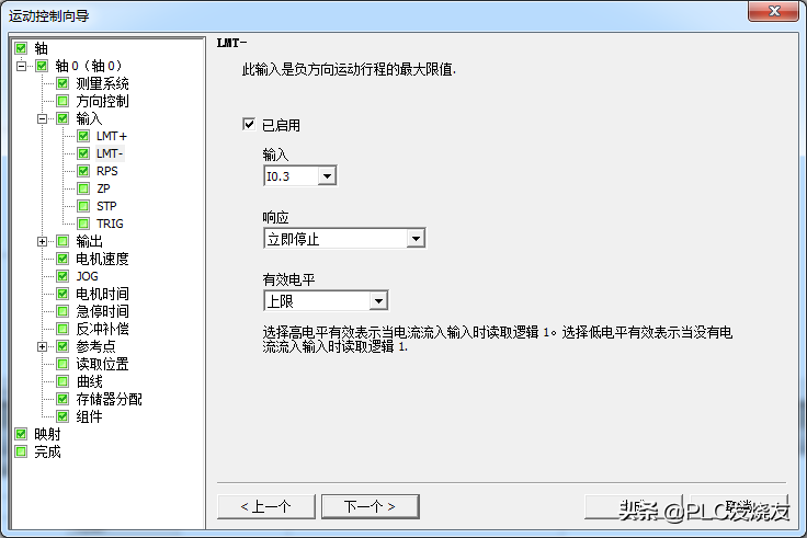 第六步: (负限位—启用—输入I0.3—响应—立即停止—有效电平—上限)
