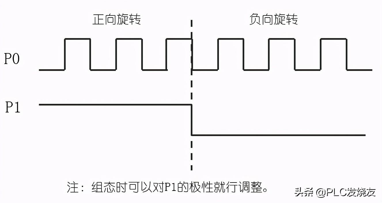 单相(2输出):组态时如果选择单相两输出,则一个输出(P0)控制脉冲,另一个输出(P1)控制方向。如果需要正向运行时,则P1为高电平有效,如果需要负向运行时,则P1位低电平有效。