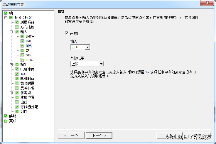 第七步: (回原点—启用—输入—I0.4—有效电平—上限)