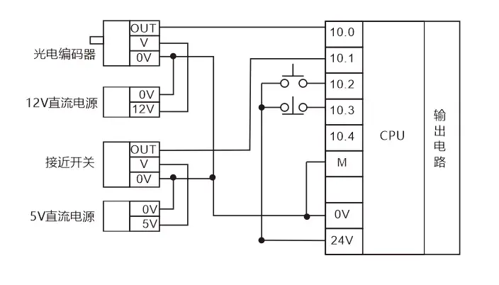 直流有源输入输入信号一般都是24V,这类信号与其他无源开关量信号混合接入PLC输入点时电压的0V点一定要接。上图输入点I0.0,I0.1连接光电编码器,接近开关的输出OUT信号,它们的驱动电源由PLC自身的24V电压提供